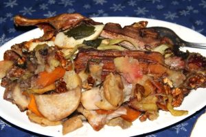 Hozzávalók: 1 vadkacsa (kacsa), 20 dkg zeller, 1 csokor zeller zöld, 5 szem szilva, 2 alma, 1 evőkanál barnacukor, fehérbors, 1 kávéskanál só, 10 dkg (mangalica) zsír, maréknyi dió, 2 gerezd fokhagyma. A nudlihoz: 50 dkg burgonya, 2 tojás, 1 kávéskanál só, 20 dkg kukoricaliszt, 8 dkg finomliszt, kevés étolaj.