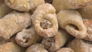 Hozzávalók: 50 dkg liszt, 2 dkg élesztő, 1 teáskanál cukor, 8 evőkanál tej, 20 dkg margarin, 1 tojás, késhegynyi só. Töltelék: 25 dkg darált dió, 20 dkg cukor, 1 vaníliás cukor, 1 citrom reszelt héja, fél dl forró tej. A forgatáshoz porcukor.