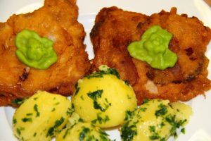 Hozzávalók: 6 szelet sertéskaraj, 15 dkg liszt, 1 tojás, 4 babérlevél, só, őrölt feketebors, 6 szelet füstölt tarja, 3 dkg vaj, 1 teáskanál őrölt paprika, 3-4 dl sör, 1 csokor petrezselyemzöld, 50 dkg apró szemű krumpli, sertészsír, 4 evőkanál étolaj.