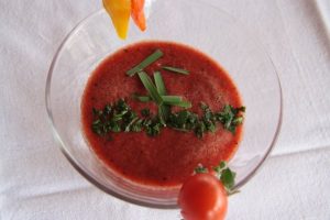 A paradicsomok héját lehúzzuk, felaprítva hozzáadjuk. Rádobjuk a durvára vágott fokhagymát és a zöldfűszereket. Ízesítésként borecetet, sót, borsot használunk, majd az egészet összeturmixoljuk.