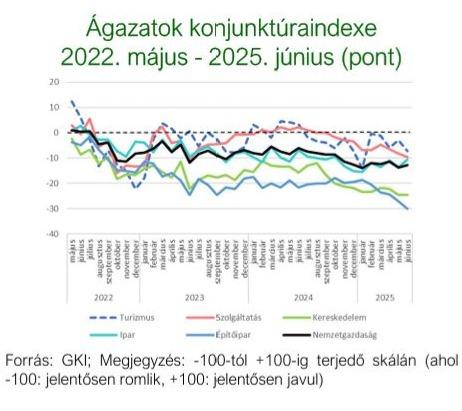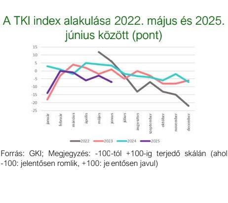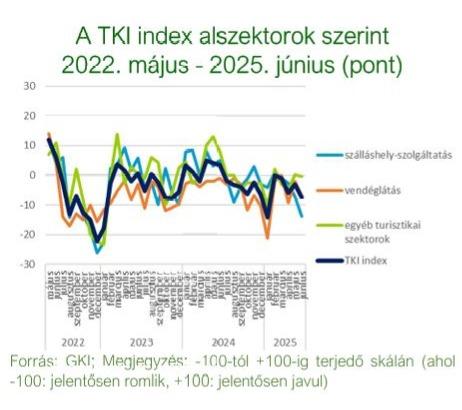 A TKI index 2025. júniusban -7 ponton állt (-100 és +100 közötti skálán értelmezve), mely azt jelenti, hogy az ágazat szereplői helyzetüket romlónak érzékelték. Az index értéke a múlthavi 3 pontos emelkedés után 4 ponttal csökkent az év hatodik hónapjában, s így 10 ponttal elmaradt az egy évvel ezelőtti értékétől. A szálláshely- szolgáltatásban 7 ponttal -14 pontra, a vendéglátásban 5 ponttal -7 pontra csökkent az index, az egyéb turisztikai szektorban pedig 0 ponton stagnált.