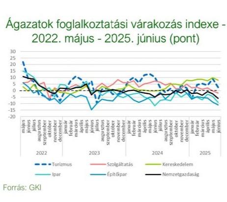 A turizmus foglalkoztatásivárakozás indexe (+2 pont) 2025.júniusban meghaladta a GKI EU számára végzett konjunktúrakutatásában mért, a szolgáltatási szektorra számított index értékét (-2 pont), ennél is jobban a nemzetgazdasági átlagot (-6pont). Elmaradt kissé a kereskedelemindexétől (+8 pont), meghaladta ugyanakkor az építőipar (-11 pont),valamint az ipar indexeit (-9 pont).