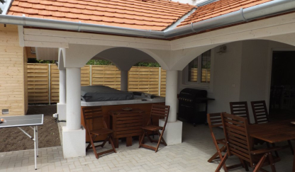 14+2 férőhelyes kétszintes, minden helységében légkondicionált, modern, jól felszerelt, új építésű nyaraló. 800 m2-es telken, 20 méter széles vízparttal. Az épületben 6 db szoba + nappali amerikai konyhával, 5 db fürdőszobával, WC-vel található. A vízpart felől fedett terasz, kerti ülőgarnitúrával. Az épület hőszivattyúval fűthető, hőszigetelt, téliesített. A zárt udvaron föld feletti felnőtt medence,gyerekmedence, 6 személyes jacuzzi, szauna, fa játszótér, bográcsozó, szalonnasütő, grilltárcsa, trambulin, pingpong asztal, csocsó. A vízparton nagyméretű stég, csónak, vízibicikli, parti világítás. Szabad Wifi. A vendégházban jó minőségű vezetékes ivóvíz van.