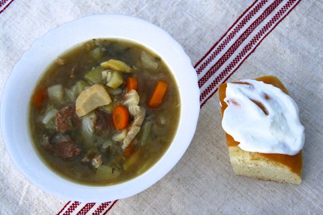 A bográcsba négy liter vizet öntünk, beletesszük a kamillateát, pár percig főzzük benne. Ezután apróra vágott vöröshagymával húsz percig forraljuk. A húst felkockázva a lobogó vízbe borítjuk. Teatojásban helyezzük mellé az orbáncfüvet is. Újabb húsz perc elteltével sózzuk, borsozzuk, gyömbért és szegfűborsot adunk hozzá. Fél óra múlva beletesszük a laskára vágott káposztát, a felkarikázott sárgarépát és petrezselymet, a zöldbabot. A levét pótolhatjuk, hogy ellepje a bogrács tartalmát.
