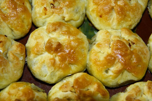 Hozzávalók: töltelék: (dupla adag, a káposztás gombócokhoz is elegendő) 1 kg darált sertéshús, 50 dkg vöröshagyma, 1 fakanál sertészsír, ½ teáskanál őrölt feketebors, 1 teáskanál só. A káposztához: 2 kg fejes káposzta, 1 liter víz, 3 babérlevél, 1 evőkanál só, 2 evőkanál 15%-os ecet, 1 csokor kaporszár és virág, csombor. Tészta: 50 dkg liszt, 20 dkg margarin, 1 tojás, 3 tojás sárgája, 1 dl tej, 1 kávéskanál cukor, 2,5 dkg élesztő, 1 teáskanál só.