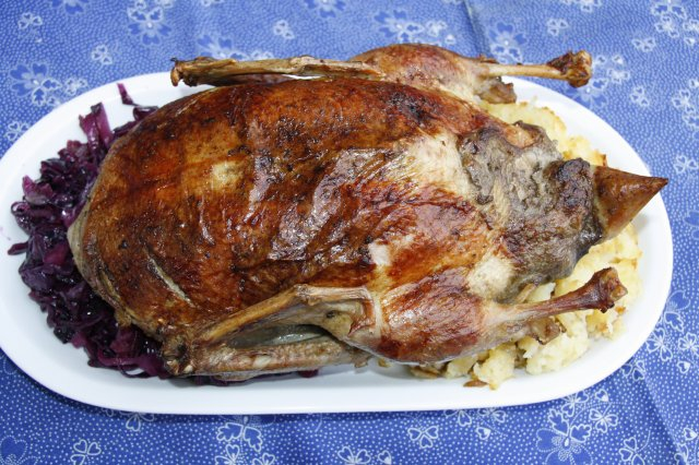Amikor minden elkészült, a kacsából kihúzzuk a hústűket (vagy cérnát), és a kétféle körettel kínáljuk.