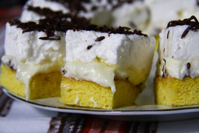 Hozzávalók: 5 tojás, 5 evőkanál kristálycukor, 1 vaníliás cukor, 5 evőkanál liszt, csipetnyi só. Krém: 20 dkg vaj, 15 dkg porcukor, 2 dl tej, 2 evőkanál liszt, 2 csomag vaníliás cukor. Tetejére: 5 tojás fehérje, 20 dkg porcukor, 5 dkg étcsokoládé.