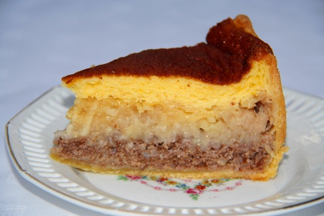 Hozzávalók: tészta: 20 dkg finomliszt, 10 dkg margarin, 1 tojás sárgája, 1 csapott evőkanál porcukor, 2 evőkanál tejföl, csipetnyi só. Töltelék: 2 evőkanál zsemlemorzsa, 1 kg alma, 1 citrom leve, 10 dkg kristálycukor, 15 dkg darált dió. Öntet: 3 tojás, 12 dkg cukor, 1 dl tejföl. A forma előkészítéséhez vaj és liszt.