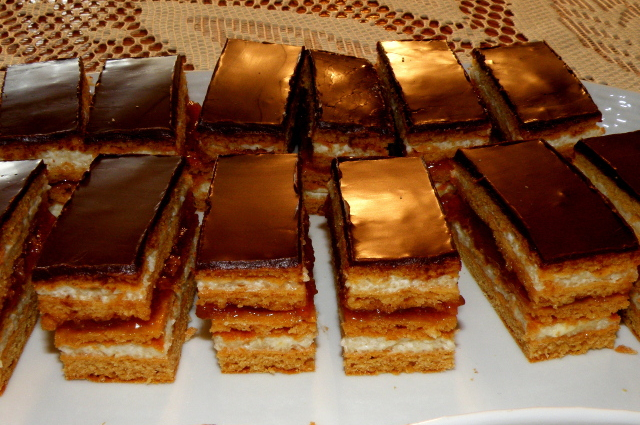 A megpihent tésztát három részre osztjuk, ezeket egyenként tepsi nagyságú lappá kisodorjuk, és sodrófa segítségével, sütőpapírral kibélelt tepsibe helyezzük. Előmelegített sütőben világosra sütjük.