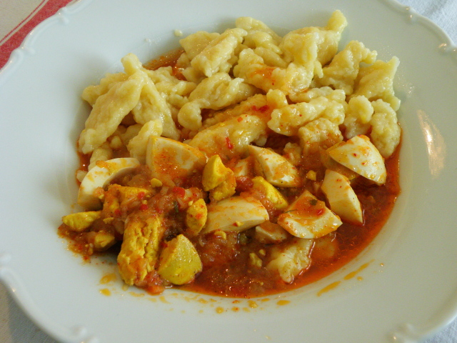 A keményre főtt tojásokat hideg vízben kicsit lehűtjük, majd megtisztítjuk. Mindegyiket 8 felé vágjuk, és óvatosan a pörköltbe tesszük. Tíz perc alatt összefőzzük. Közben keverni nem szabad, nehogy a tojások szétessenek, csak rázogatjuk a lábost.