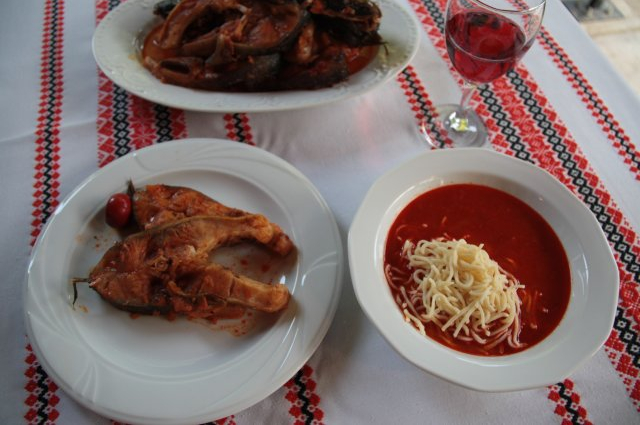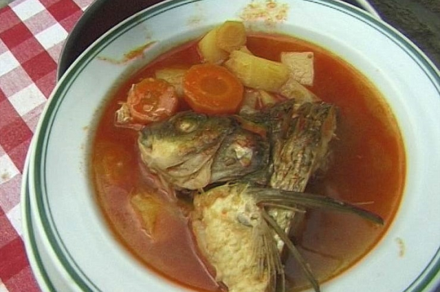 Egy tepsi alját kikenjük vajjal, ráhelyezzük a halat. Gerincét sűrűn megrakjuk vajforgácsokkal, locsolunk rá és mellé 1-2 dl hal alaplevet.