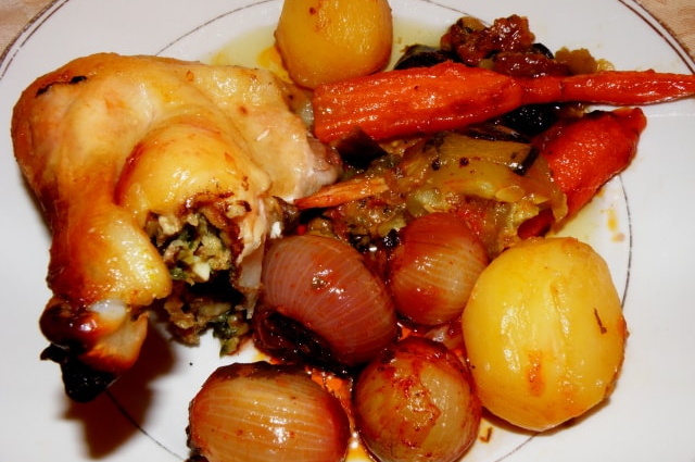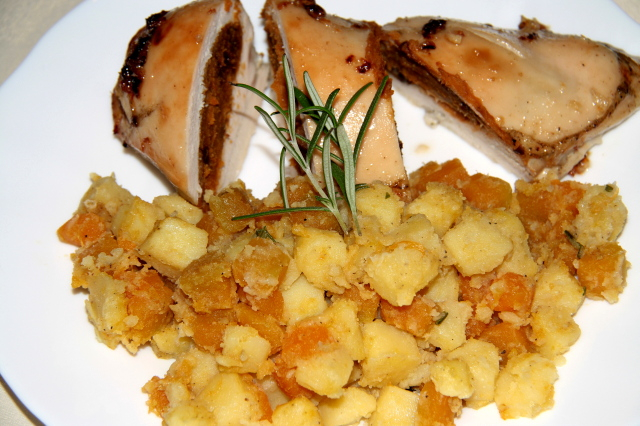 Hozzávalók: 80 dkg csirkemell, 30 dkg sütőtök, 25 dkg ízesített (édes) gesztenyemassza, 10 szem aszalt szilva, 1 teáskanál őrölt rozmaring, 1 teáskanál majoránna, csipetnyi őrölt színes bors, fél dl étolaj, 2 gerezd fokhagyma, 10 dkg bacon szalonna, 2 evőkanál akácméz. A körethez: 40 dkg sütőtök, 40 dkg burgonya, 1 teáskanál őrölt feketebors, 2 teáskanál őrölt rozmaring, 2 teáskanál só, 2 gerezd fokhagyma, fél dl étolaj.