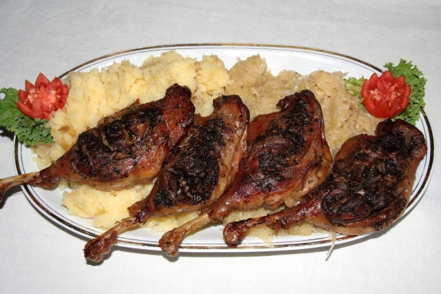 Két tepsit jó vastagon kizsírozunk. A kacsacombok bőrét bevagdossuk, hogy jobban kisüljön belőle a zsír, majd fűszerezzük borssal, majoránnával és sóval. Szorosan egymás mellé, a tepsibe helyezzük.