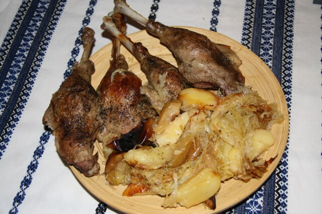 Közben elkészítjük a tarhonyát. A tojáshoz hozzáadjuk a lisztet, és jó kemény anyagot gyúrunk belőle. Egy sütőlap egyik végébe kevés lisztet szórunk, ebben időnként megmártjuk a tésztát, amit nagylyukú reszelőn lereszelünk. A tepsiben elegyengetjük a tarhonyát, majd langyos sütőben addig szárítjuk, amíg kezd kicsi színt kapni.