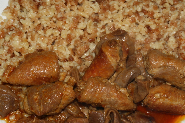 A göngyölt húsokat kivesszük a sütőből, és összekeverjük a zúzapörkölttel. 10-20 percnyi együttes forralás elegendő ahhoz, hogy összeérjenek az ízek, és a tarhonyával tálalhatjuk.