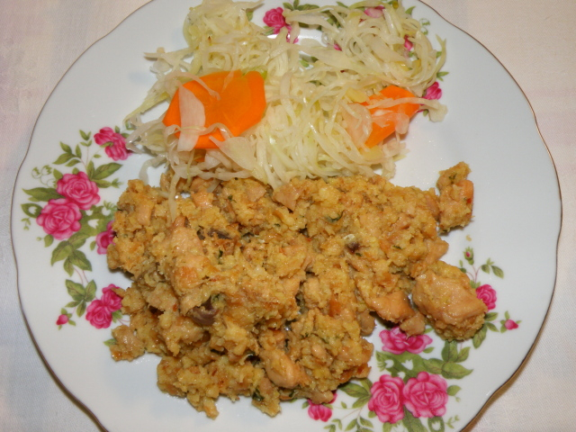 A zsemlét 4 dl vízbe, és ugyanannyi tejbe beáztatjuk, kinyomjuk, és a tojásokkal összekeverjük. Ráöntjük a húsra, és addig sütjük együtt, folytonosan kevergetve, míg apró darabkákra széteső lesz az étel.