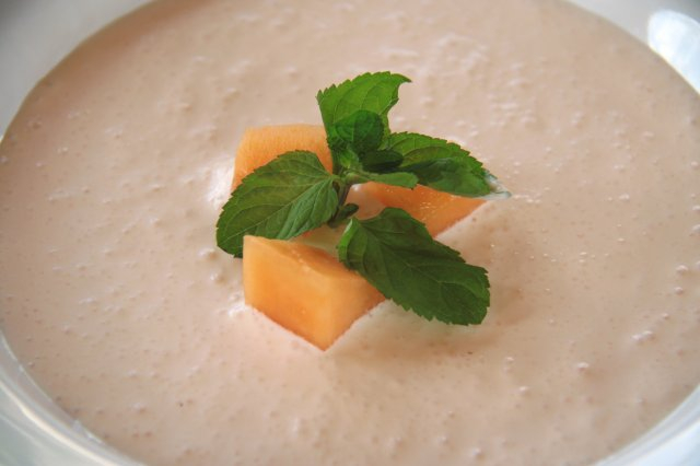 Hozzávalók: egy kg sárgadinnye, 4 dl tej, 2 csomag vaníliás cukor, 4 dl habtejszín, cukor, mentalevél.
