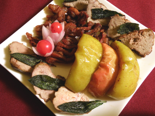 A megsült tepertőt kiszedjük, megsózzuk. A zsírjából kiveszünk, ha túl sok lenne, és a lábosba helyezzük az előzetesen áttörölgetett libamáj darabokat. Néhány perc alatt átsül, közben átfordítjuk. Rászórjuk a zsályaleveleket, hogy az is vele együtt süljön ropogósra. Mindkettőt tálra szedjük, megsózzuk, ízlés szerint borssal is megszórhatjuk. A sütőzsírból megint leöntünk, csak annyit hagyunk benne, amennyi az almához kell. Ebben először a cukrot elkevergetjük, karamellizáljuk. Teszünk hozzá vajat, és belehelyezzük az almagerezdeket. Fedő alatt, lassú tűzön sütjük. Meghintjük fahéjjal, és sütés közben apránként locsolgatjuk borral. Pár perc alatt elkészül. Kiszedjük, lecsepegtetjük, a libamáj, és a tepertő mellé kínáljuk. Pirítós kenyeret adhatunk mellé.