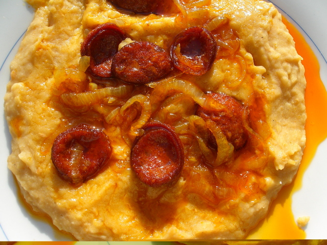 A leszűrt babot szűrőkanálban átpasszírozzuk, hogy a haja ne kerüljön bele. Tűzre tesszük, kevés tejjel, és 1 evőkanál liszttel összesütjük. Tányéron szétterítjük, a tetejét hagymás zsírral locsoljuk, és megrakjuk sült kolbászdarabkákkal.