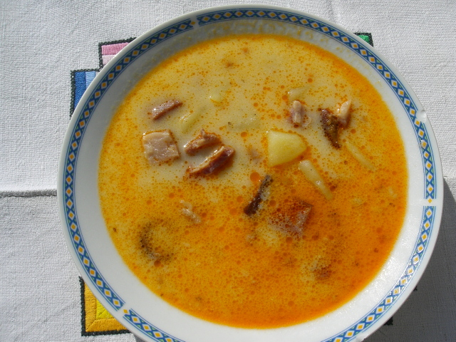 Hozzávalók: (10 főre) 2 kg füstölt hús (oldalas, vagy tarja), 30 dkg füstölt kolbász, 1 kg sertéshús (comb, lapocka, tarja), 3-4 kg krumpli, 2 nagy vöröshagyma, 10 babérlevél, só, 1 liter tejföl, 1 dl tej, liszt a habaráshoz.