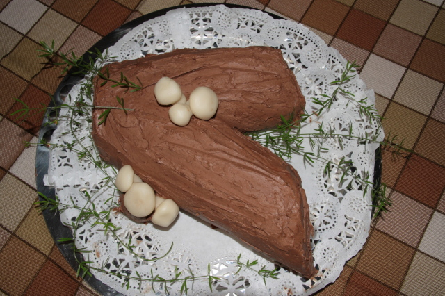 Ezután kb. ¾ résznél rézsútosan elvágjuk. A kettéválasztott tésztát egyenként kihajtjuk, majd a belsejébe töltjük a csokis krém kétharmadát. Mindegyiket visszatekerjük. A kisebb ág végét megkenjük krémmel, hogy jobban ragadjon, majd ferdén a másik mellé illesztjük. Így nyeri el jellegzetes, fatörzs formáját, amit a megmaradt krémmel bevonunk. Villával, vagy késsel barázdákat húzunk, hogy kérges legyen a tortánk, és tetszés szerint zöld ágakkal, és marcipánból formázott kis gombákkal díszíthetjük. Pár órára hideg helyre tesszük, utána szeletelhető.