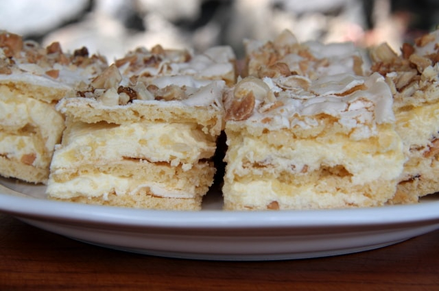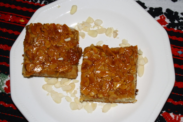 A mézes öntethez hozzákeverjük a darabolt mandulát, és összepirítjuk. Ráborítjuk a tésztára (nem baj, ha folyik), majd előmelegített sütőben kb. 25 perc alatt megsütjük. Kicsit hűlni hagyjuk, a széleit levágjuk, és kockákra vágva kínáljuk.