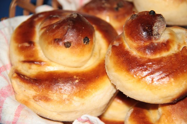 Lisztezett deszkán is átdolgozzuk, két centi vastagra kisodorjuk, és csíkokra vágjuk. Ezeket egyenként megsodorjuk. Egyik végét vastagabbra hagyva kicsit felhúzzuk (ez lesz a madárka feje), a többivel körbetekerjük. Felvert tojással átkenjük, a szemek helyére borsot nyomunk. Kizsírozott tepsiben harminc percig pihentetjük, majd szép színesre sütjük.