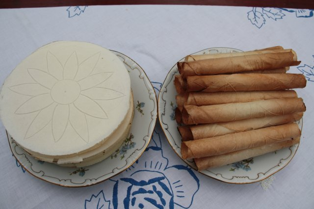 Az előzőhöz hasonlóan sütjük, amikor elkészült, a vasat szétnyitjuk, és azonnal feltekerjük egy fa rúdra. Rögtön lehúzhatjuk, megtartja a henger alakú formáját.