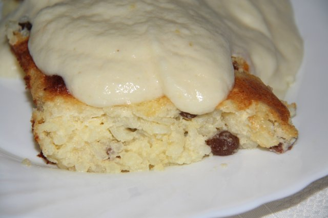 Hozzávalók: 2 liter tej, 1 dl víz, 48 dkg rizs, fél citrom, 10 tojás, 15 dkg vaj, 30 dkg cukor, csipetnyi só, 1 citrom reszelt héja, 10 dkg rumba áztatott mazsola, 2 evőkanál liszt. A sodóhoz: 8 dl fehérbor, 4 dl víz, 8 tojás, 40 dkg porcukor, 4 púpos teáskanál liszt, csipetnyi só, 1 citrom reszelt héja és leve. A tepsihez zsír és zsemlemorzsa.