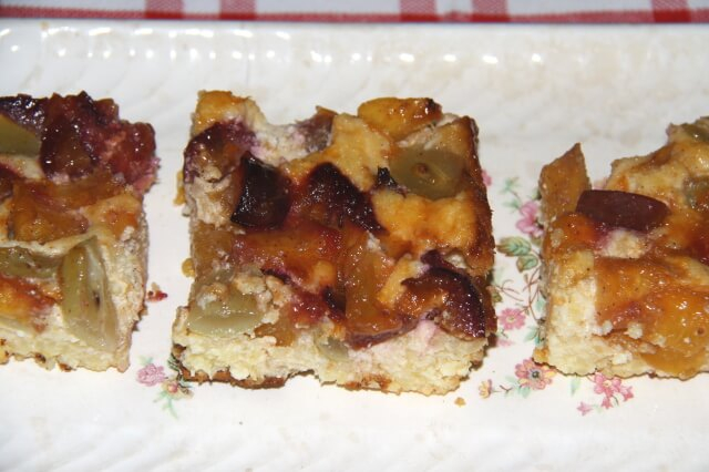Beleöntjük a masszát. A tetejét megszórjuk az előkészített gyümölcsökkel.