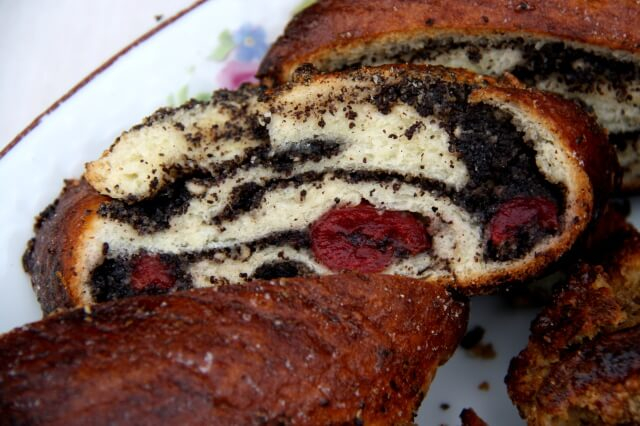 Az idő közben megkelt tésztát négy részre szétvágjuk, Az elsőt vékonyra kisodorjuk. Rákenjük a diós tölteléket úgy, hogy mindenhova jusson. Feltekerjük, a vastag rudat hosszában, középen késsel szétvágjuk, és a kalácsot megfonjuk. Kizsírozott tepsibe beletesszük, tojással átkenjük a tetejét, kicsit még így is kelesztjük, majd forró sütőben, vagy kemencében aranyló barnára kisütjük. Amikor elkészült, egy citrom levét porcukorral elkeverjük, és megkenjük vele a forró kalácsot. Hagyjuk kihűlni, utána szépen szeletelhető.