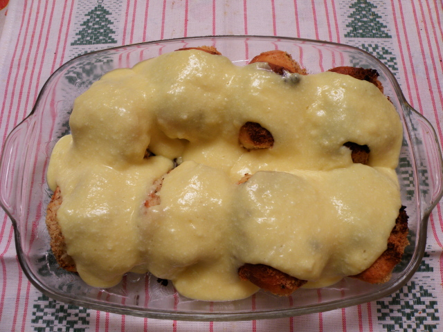 Hozzávalók: 1 kg liszt, 2 dl langyos tej, 2 tojás, 10 dkg kristálycukor, 10 dkg darált dió, 15 dkg margarin (vaj), 5 dkg sertészsír, 2 dl aludttej, citromhéj, csipetnyi só, 5 dkg élesztő. A krémhez: 1 liter tej, 1 vaníliás pudingpor, 2 evőkanál liszt, 4 tojás, 30 dkg kristálycukor, 1 csomag vaníliás cukor. A forma kikenéséhez sertészsír, 1 evőkanál liszt. A galuskák tetejére olvasztott margarin.