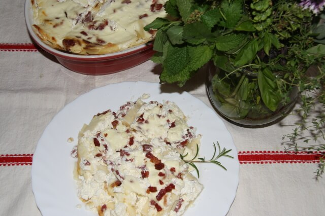 A sonkát apróra daraboljuk, és kevés sertészsíron megpirítjuk. Az aljában összegyűlt zsiradékból öntünk egy keveset a sütőtálba. Befedjük a főtt tészta felével, gazdagon megszórjuk túróval, amit enyhén megsózunk, és rákanalazzuk a sonka felét. Megkenjük bőven tejföllel, újra tésztát pakolunk, majd túrót, sonkát, tejfölt.