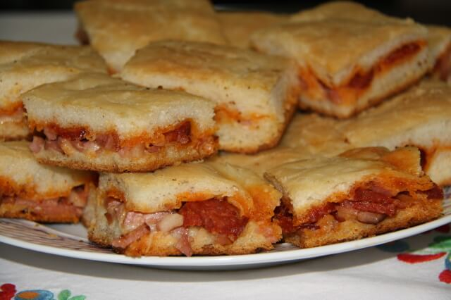 Hozzávalók: 80 dkg liszt, 5 dkg élesztő, 1 dl étolaj, 2 mokkáskanál cukor, fél dl tej, öt és fél dl víz, 3 teáskanál só, 2 evőkanál sertészsír. A töltelékhez: 40 dkg füstölt sonka, 40 dkg füstölt kolbász.