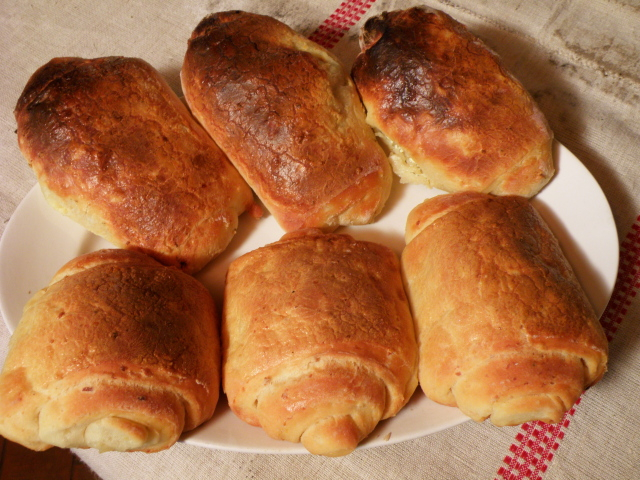 A harmadik változathoz a túrót a tejföllel, sóval, és az apróra vágott kaporral összekeverjük. A tésztát kisodorjuk, téglalapokra vágjuk, és a töltelékből mindegyiken elegyengetünk egy keveset. Feltekerjük, és úgy helyezzük a zsírozott tepsibe, hogy a hajtások alulra kerüljenek.
