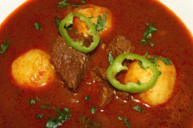 Hozzávalók: összesen 2 kg marhalapocka, marhafartő és marhalábszár, 40 dkg vöröshagyma, 15 dkg fokhagyma, 1 csokor zeller zöldje, 2 sárgarépa, 2 petrezselyem gyökér, fél zellergumó, 25 dkg sertészsír, 2 paradicsom, 1 csípős paprika, 5 evőkanál őrölt paprika, 1 evőkanál só, 1 teáskanál őrölt feketebors, 1 kávéskanál őrölt kömény, kis csokor petrezselyem zöldje.