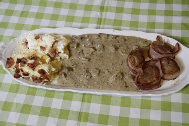 Baconba tekert szűzérmék erdei gombamártással, juhtúrós puliszkával