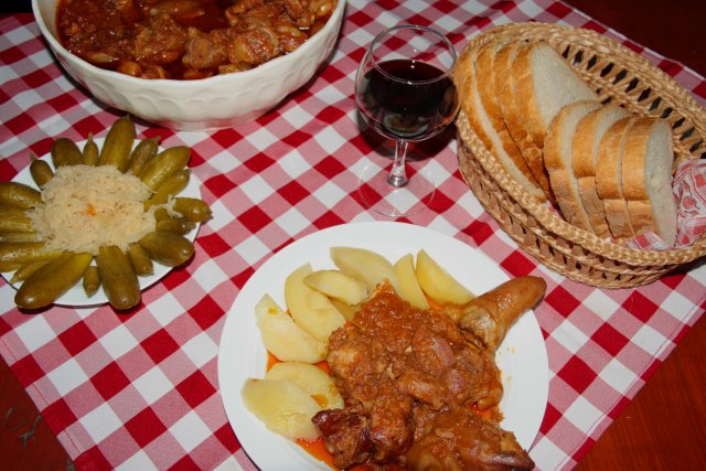 Sós, babérleveles vízben főtt burgonyát és savanyúságokat kínálunk a pincepörkölt mellé.