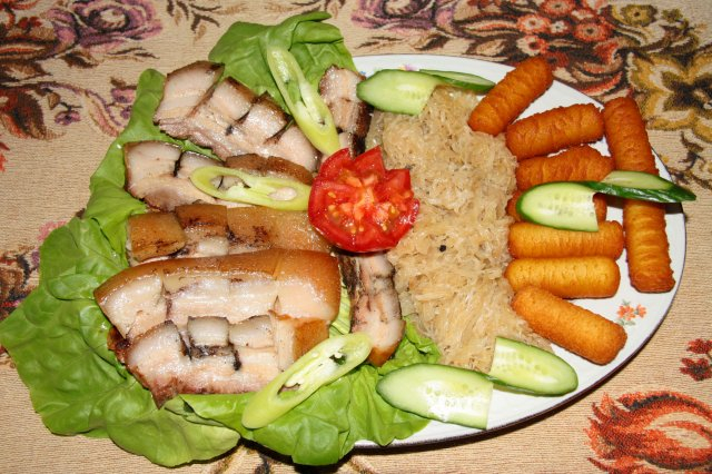 Hozzávalók: 1db malac császárhús, 5 evőkanál sertészsír, só, őrölt feketebors, 2 dl világos sör, 50 dkg savanyú káposzta, 20 szem színes bors, köretnek burgonyakrokett.