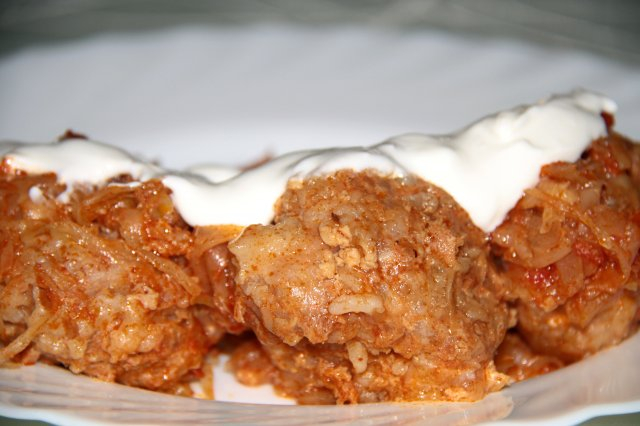 Hozzávalók: (10 főre) 1,5 kg darált lapocka, 3 tojás, só, 3 púpos evőkanál őrölt paprika, 30 dkg rizs, 2 kávéskanál őrölt feketebors, 8 babérlevél, 3 teáskanál egészbors, 50 dkg vöröshagyma, 4 evőkanál sertészsír, 1,5 liter abalé (húslé), 2,5 kg káposzta, 5 dl paradicsomlé, 2 púpos evőkanál liszt. Tálaláshoz tejföl.
