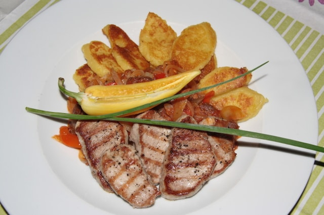 A szűzpecsenyéről az inakat eltávolítjuk, majd másfél centi vastag szeletekre vágjuk. Tenyérrel lenyomkodjuk, klopfolni nem szükséges. Sóval, borssal fűszerezzük. Előmelegített, zsírozott sütőlapon mindkét oldalán hirtelen átsütjük.