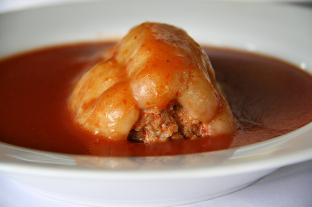 Hozzávalók: (8 főre) 8 szép nagy paprika, másfél liter paradicsomlé, fél liter víz, 2 vöröshagyma, 1 szál zeller zöld, 1,5 kg darált sertéshús (dagadó), só, 2 teáskanál őrölt bors, 10-15 dkg rizs, 2 evőkanál zsír, 3 evőkanál liszt, 4 evőkanál cukor.