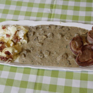 Baconba tekert szűzérmék erdei gombamártással, juhtúrós puliszkával